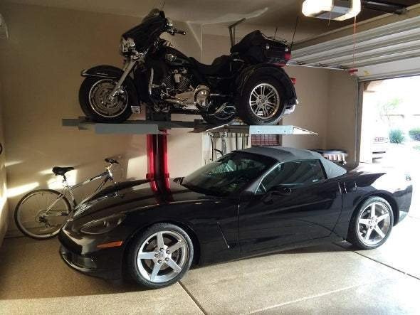 The ML-2000 take up less room in your garage, while creating amble space for other garage activities. and runs on a 110V power unit. The ML-2000 comes with 3 removable center Aluminum Deck Inserts (54″ W x 21″ D), six drive-on aluminum ramps.